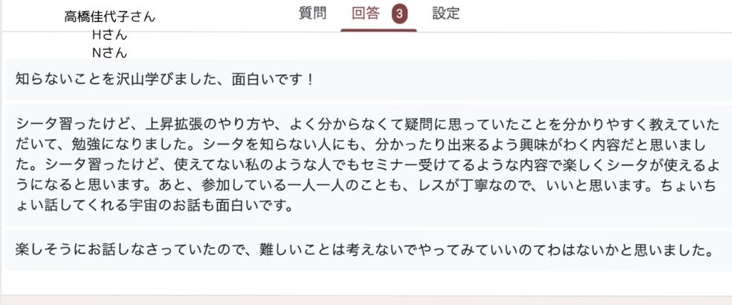 1度で既に生活の見え方が変化し、3度目のつぎのひからは、自分を大切にしようという自分ファースト思考が生まれてきました。誰かが嫌がるかなとか思う考えも出てきましたが、自分の事、想いを先に考え自分が大事だということを思い出し行動していけるようになっています。