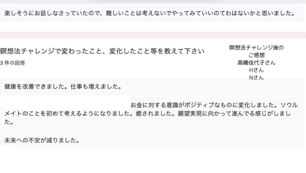課題が浮き彫りになって落ち込んでいたタイミングで、セッションのご案内をいただいてありがたかったです。「ずっと(私がいいなと思っているような)未来が見えてる」との言葉に、前向きになれました。ありがとうございます。
